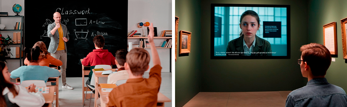 A destra una persona al museo che legge i sottotitoli di un video.