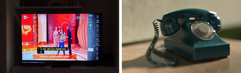 A destra un vecchio telefono fisso a cornetta.