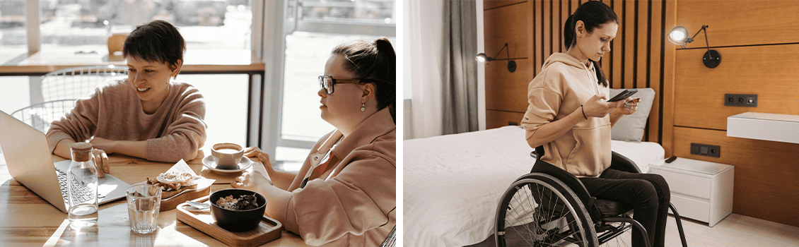 A destra una persona in carrozzina con un cellulare in mano in una camera d'albergo