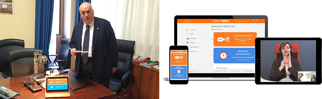 VEASYT Live! è attivabile da qualsiasi tablet, computer o smartphone a disposizione dell’AO San Pio; il personale preme un pulsante e in meno di 30 secondi l’interprete risponde in videochiamata dal proprio ufficio, pronto a tradurre simultaneamente tutto quello che viene detto tra personale dell’AO San Pio e paziente sordo.
