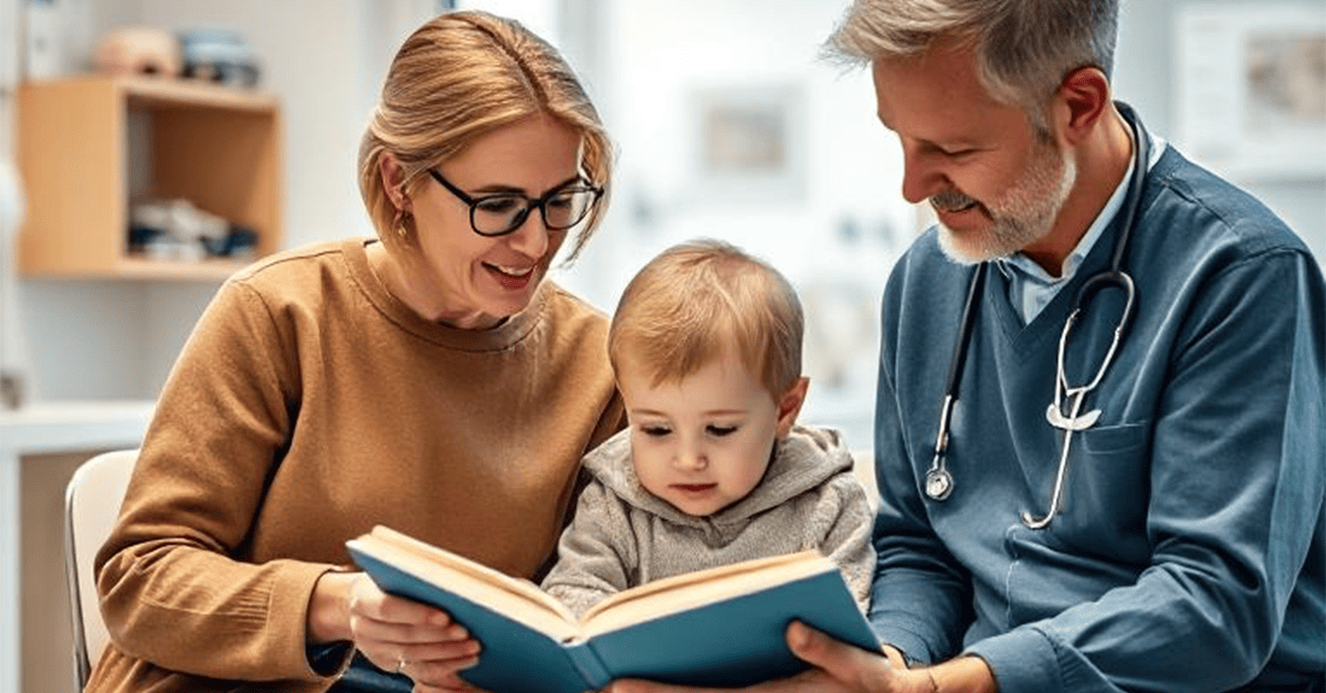 Una donna ed uno un professionista sanitario che leggono un libro con un bambino