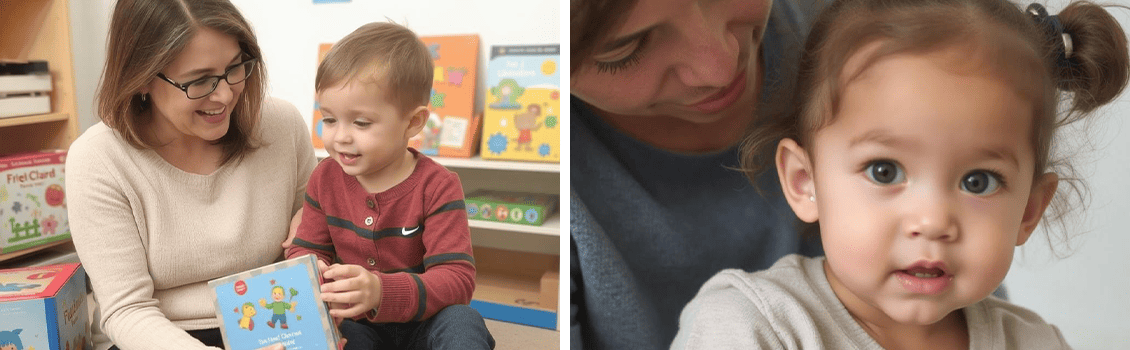 A destra una bambina in primo piano con protesi acustiche in braccio ad una donna