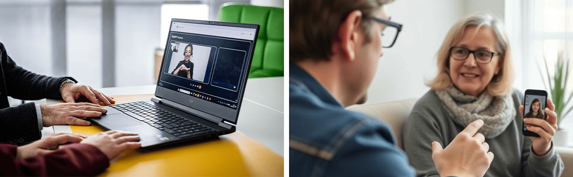 A sinistra due persone che utilizzano il servizio di video-interpretariato LIS tramite PC
