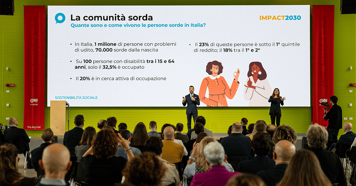 Foto dell'evento IMPACT2030, sul palco Enrico Capiozzo e Linda Cecchin di VEASYT