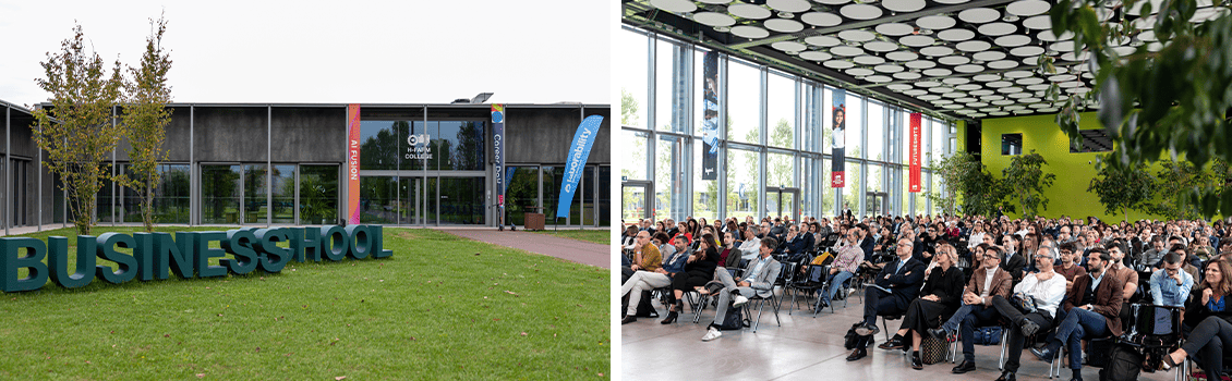 A sinistra foto dell'ingresso della Business School presso H-FARM a Roncade (TV).