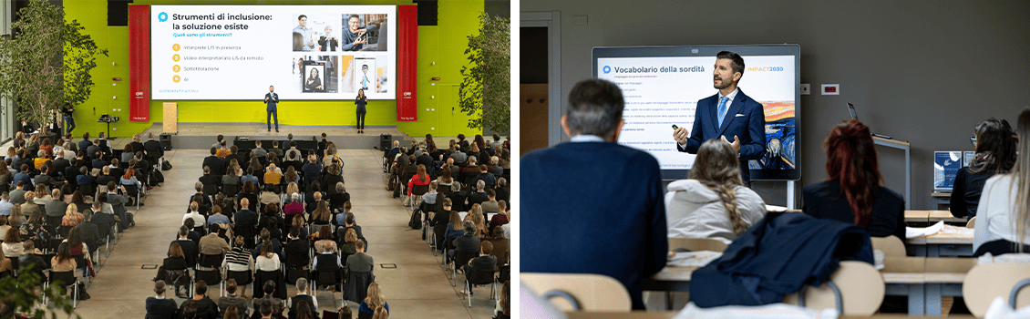 Durante l’evento, il nostro amministratore delegato Enrico Capiozzo, coadiuvato da Linda Cecchin (operation manager e interprete LIS- lingua dei segni italiana), ha presentato davanti a circa 500 persone una panoramica sul mondo della sordità. Si è parlato degli stati d’animo vissuti dalle persone sorde e delle soluzioni comunicative disponibili, come il video-interpretariato in LIS.