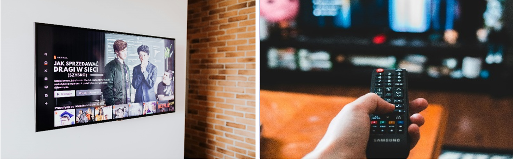 A sinistra un televisore con una piattaforma streaming con sottotitoli