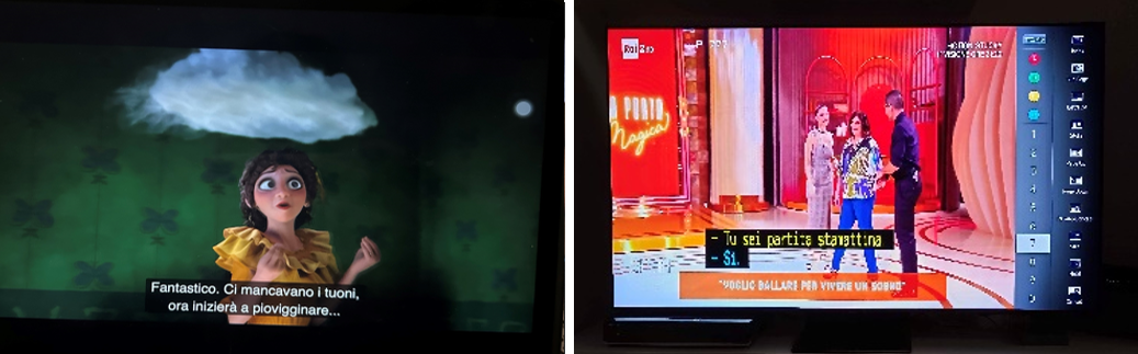 A destra una televisione con sottotitoli attivi durante un programma tv