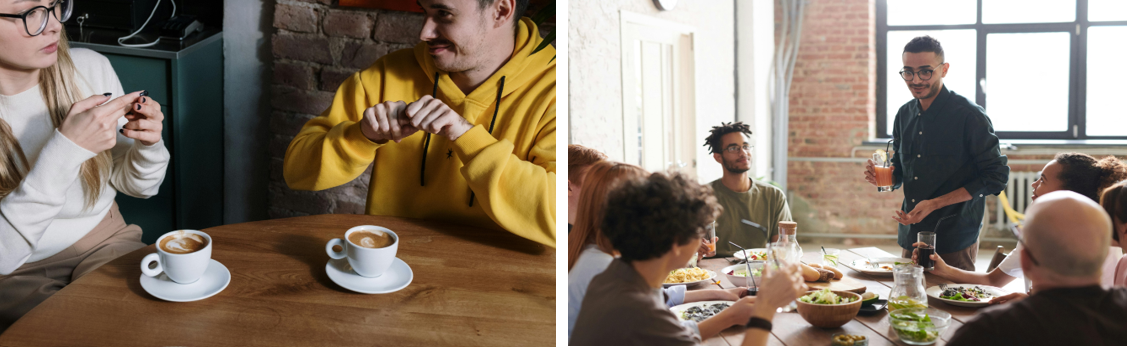 A sinistra due ragazzi sordi che comunica in lingua dei segni davanti a due caffè.