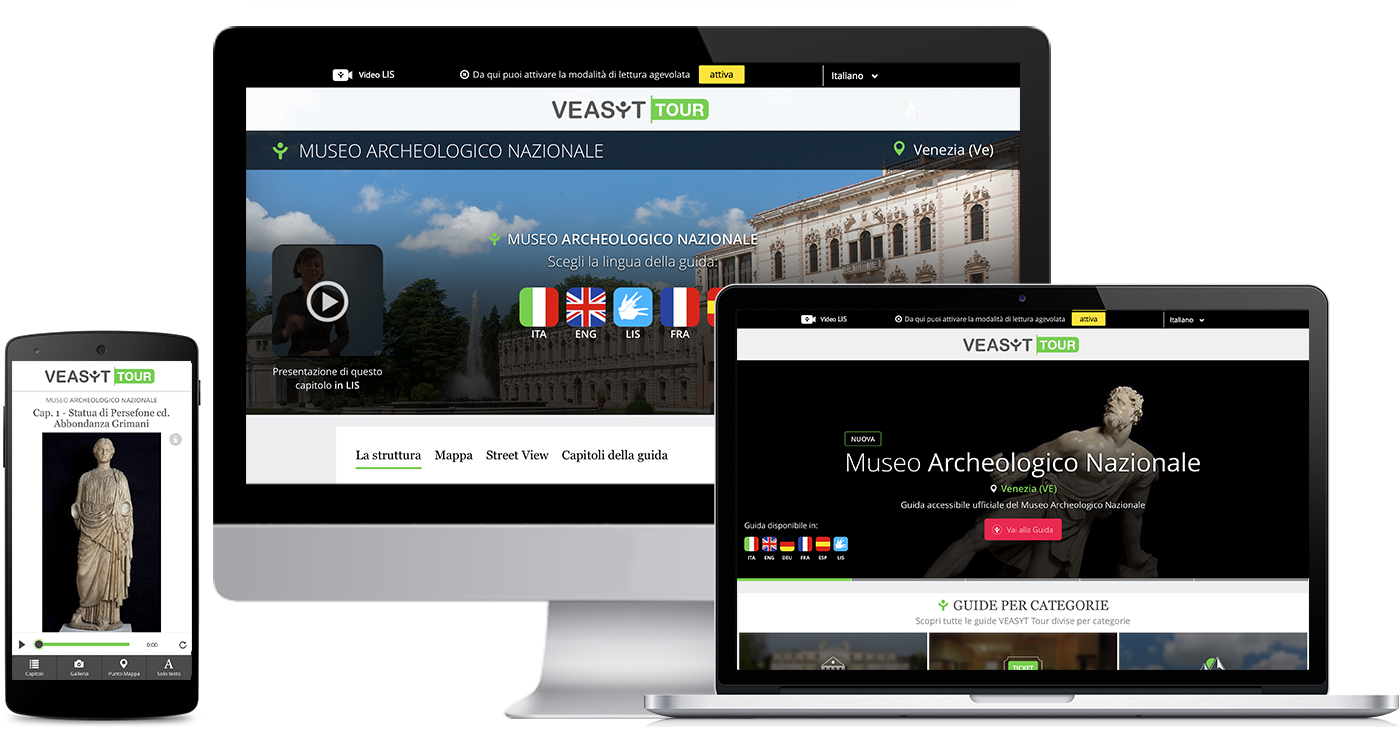 VEASYT Tour è la guida multimediale accessibile, che permette a tutti i visitatori (anche con disabilità sensoriali o linguistiche) di accedere in modo completo e autonomo a contenuti culturali o informativi su città d’arte, musei, ville, parchi, percorsi enogastronomici o naturalistici. I contenuti sono consultabili in modalità testuale, audio e video in lingua dei segni.